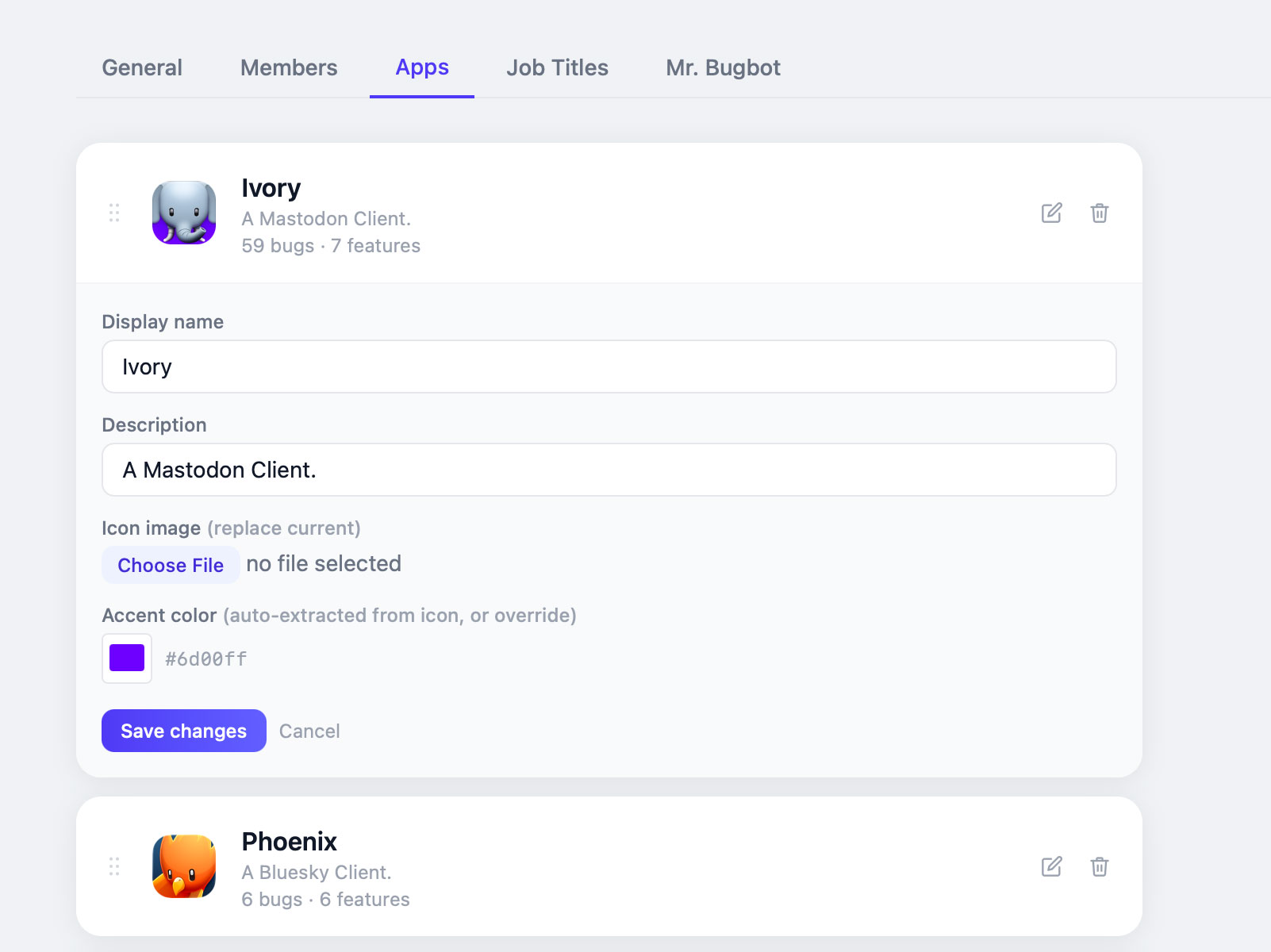 Apps is where you can add/edit apps and set their order which is reflected in the menus. When you upload an icon for an app, the website automatically chooses the most dominant color in the icon, but you can also click on the swatch and pick whatever color you want.