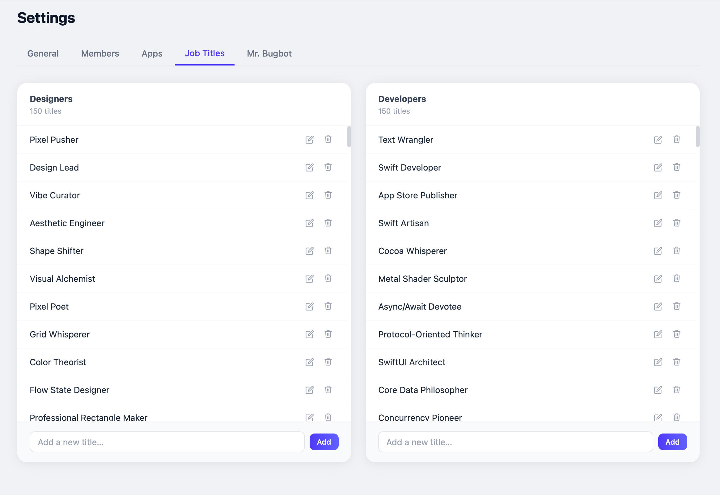 So many job titles! I’ll admit, I had Claude generate almost all of the jobs (based on various criteria), but we can always manually add funny ones we think of for each other.