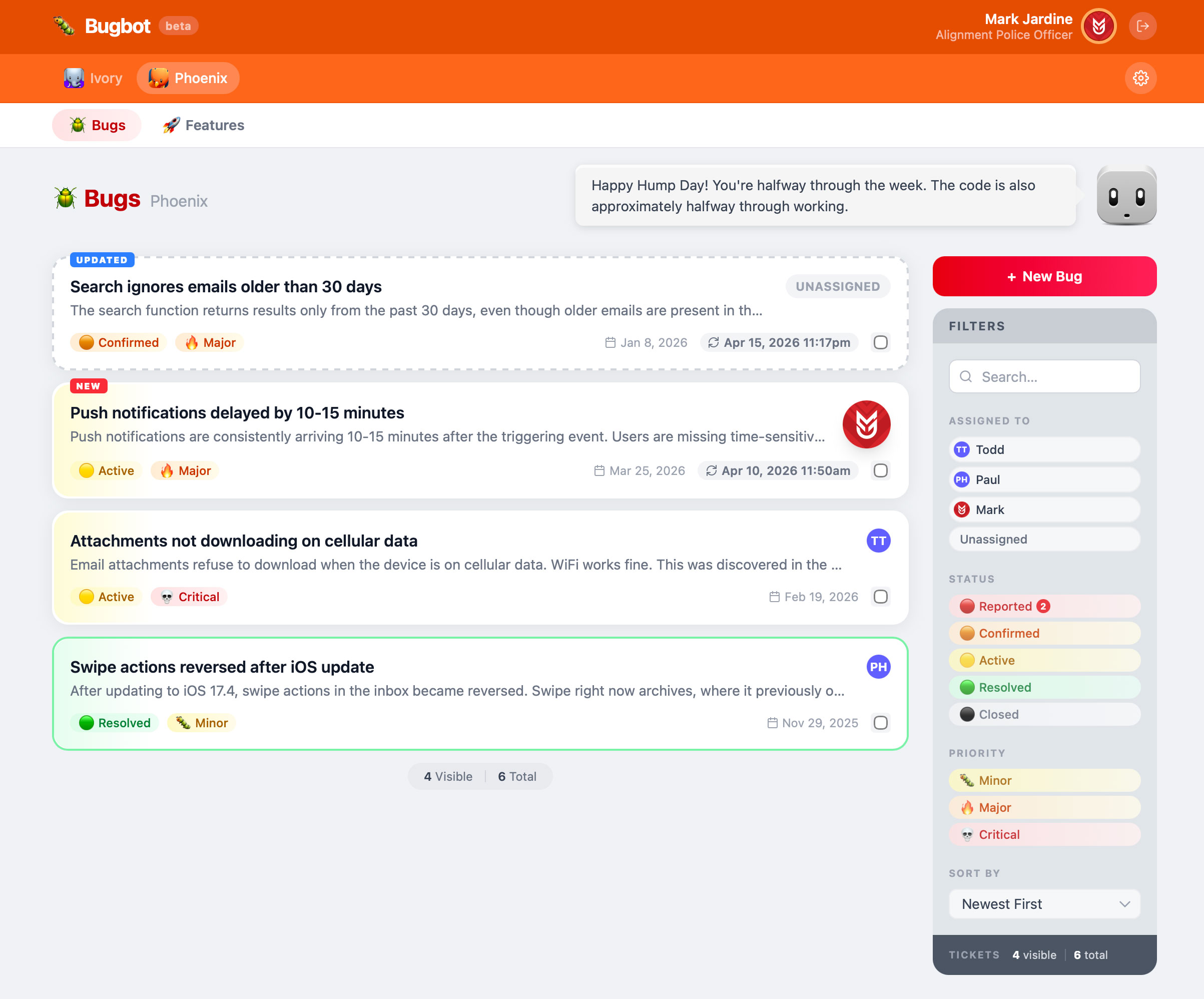As for the bot head with the speech bubble, well that was another way of me injecting some joy into a bug tracker. You’ll see him appear on various pages, but he’s far more complex than one would imagine. For one, he animates and has sounds. His quip stays the same across all pages for 20 minutes or so before he animates and shares a new random quip. Of course if you click on him, he will animate immediately and provide you a new quip. The logic for the quips is my favorite part about him. More on that later.