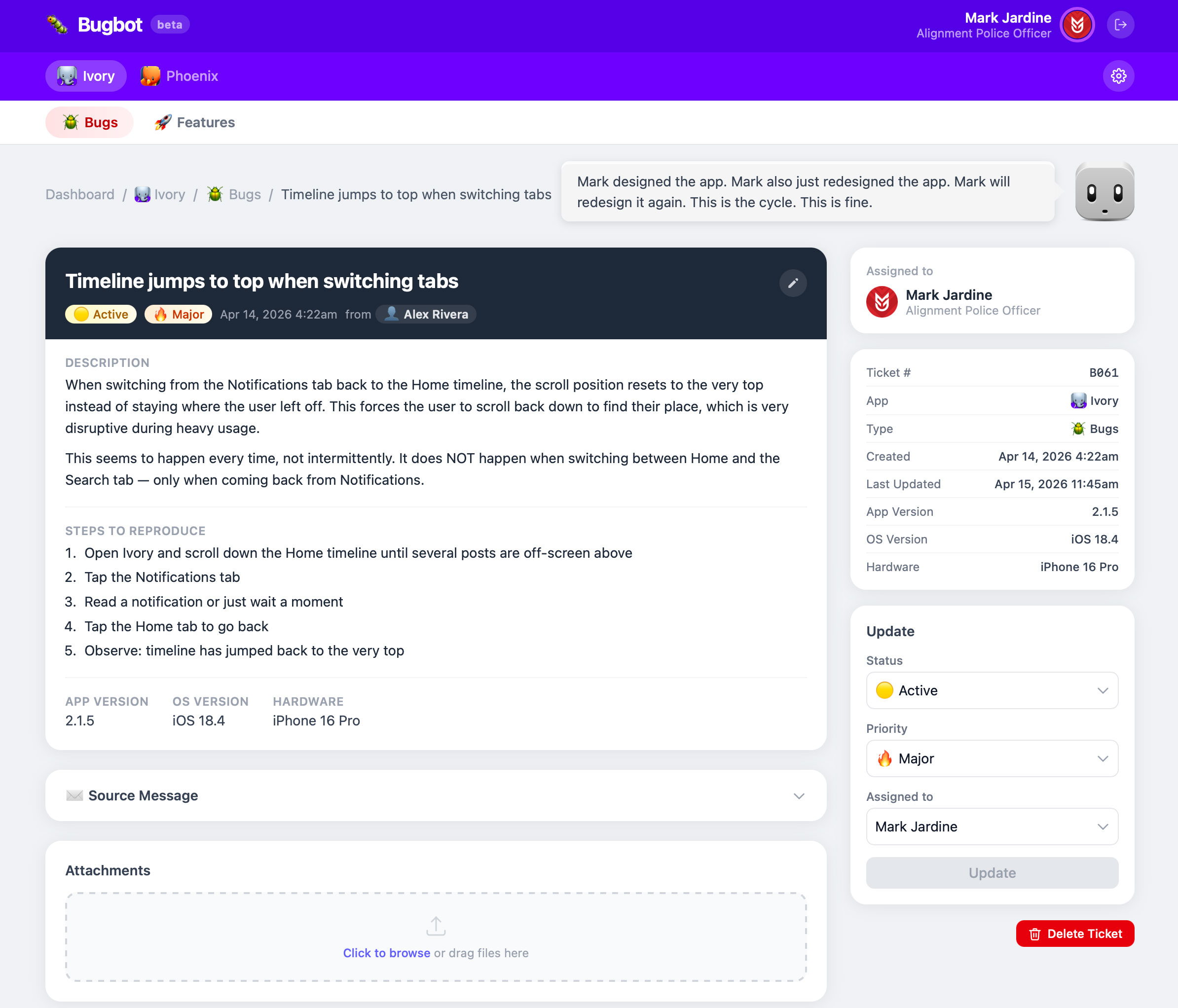 Note: Screenshots are captured from the actual functioning app on my test server. All the ticket data in these screenshots is fake. While I typed in gibberish when testing things, most ticket data was generated by Claude for testing purposes. I also used Sonnet for 99% of the work. I ran into a few issues trying to get Mr. Bugbot laid out visually which kept failing me so I tried switching to Opus, but turned out it was most likely a complex CSS/browser rendering limitation.