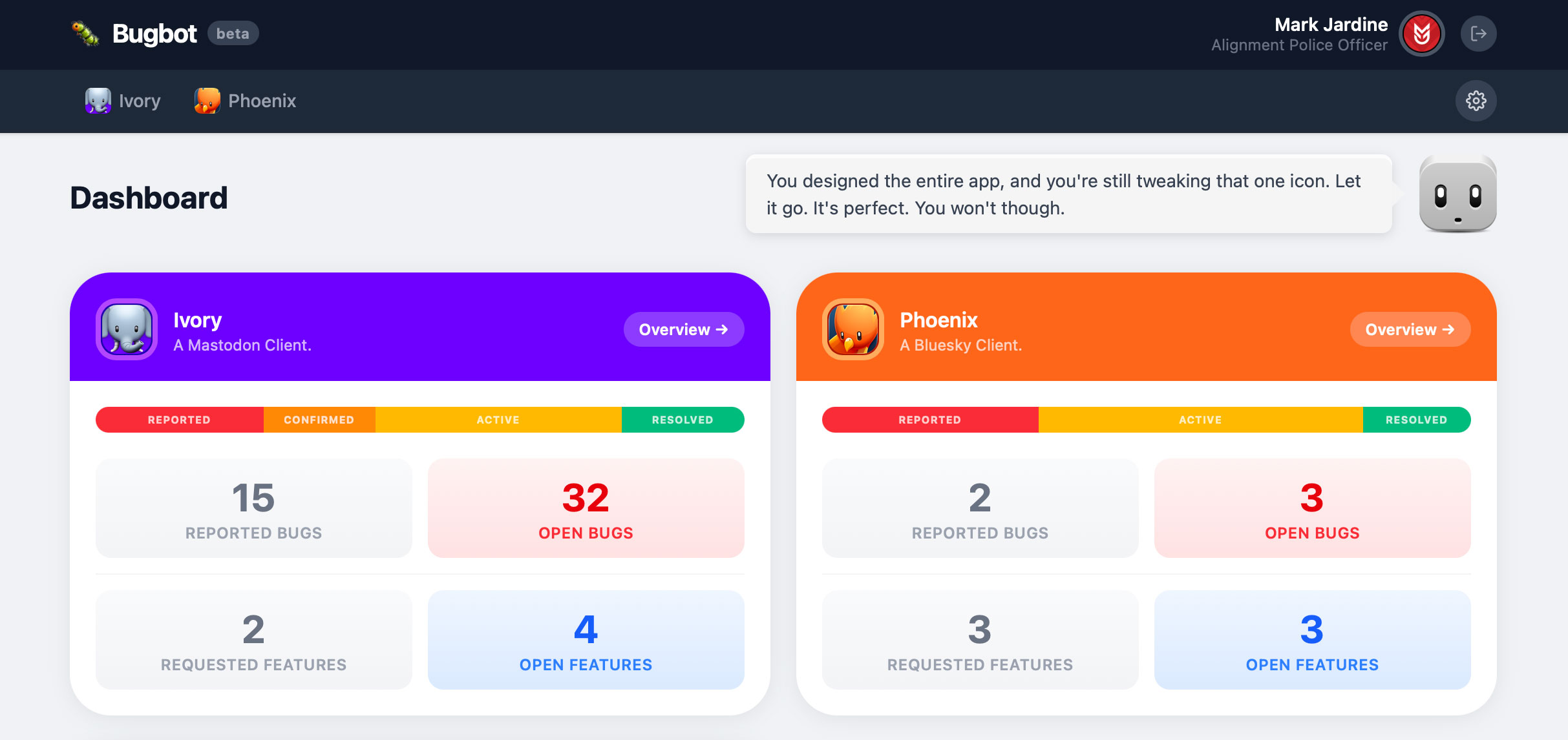 It is amazing to me that I’m able to use this fantastic bug tracking app that did not exist a few weeks ago. It’s mind-blowing. I am absolutely NOT a developer, but I have a good understanding of how development works on the web and am familiar with all the technologies needed to build an app like this. But I didn’t write any markup, any CSS, any JavaScript, nor did I do any design work (besides quickly throwing together that Mr. Bugbot head).